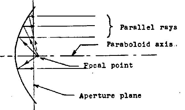It is also a basic property of a parabolic reflector that the total length of each reflected ray from the focal point to the aperture plane is a constant length. This latter property means that energy at a fixed frequency originating at the focal point will be distributed over the aperture plane with uniform (constant) phase. These properties cause the beam forming characteristic of a parabolic reflector antenna much the same as a flashlight produces a beam of light when the bulb filament is located at the focal point of the small mirrored parabolic reflector in the flashlight.