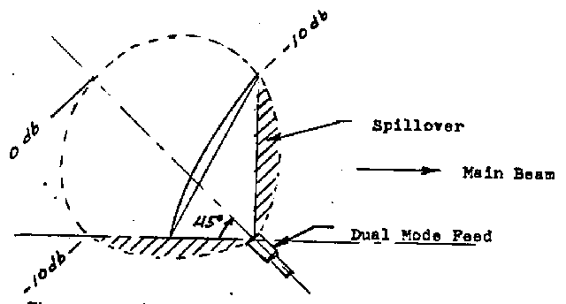 Since all rays emanating from the focal point behave in the same way, we may choose to direct energy from the focal point to any region of the paraboloid which will then form a beam. In the design described in this report, we choose a region just of the paraboloidal axis so that the feed antenna is outside of the region (aperture area) of the reflected rays. The term off-set therefore designates that the reflector surface region used is off-set from the paraboloidal axis but the feed horn antenna is still located at the focal point. The feed horn axis is however tilted to illuminate the chosen area of the reflector surface and the center of the feed horn aperture (phase center) is located at the focal point of the of the paraboloid. A cross sectional drawing of this geometry is shown below for the particular case of the dual mode feed. The dual mode feed is chosen not only because of its high illumination efficiency as pointed out in Report #5, but because it will also result in the most compact form of the off-set antenna design.