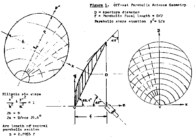 If there is any disadvantage to the off-set reflector antenna design it is the different and somewhat awkward geometry. The remainder of this report will present geometric details and suggestions for construction of a specific off-set parabolic reflector antenna design.
